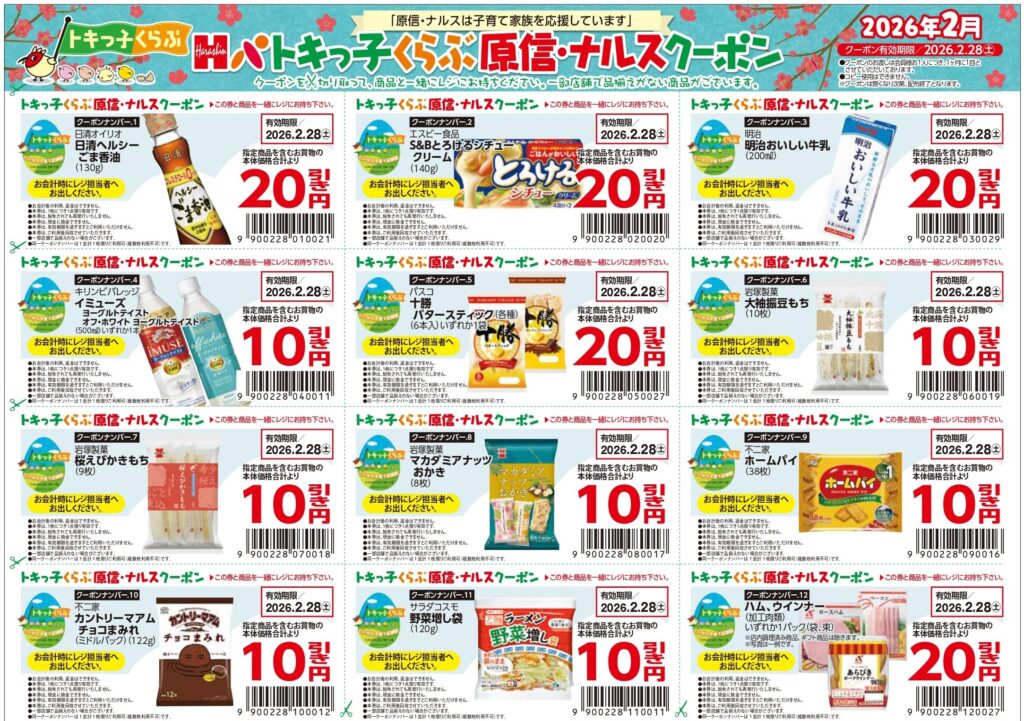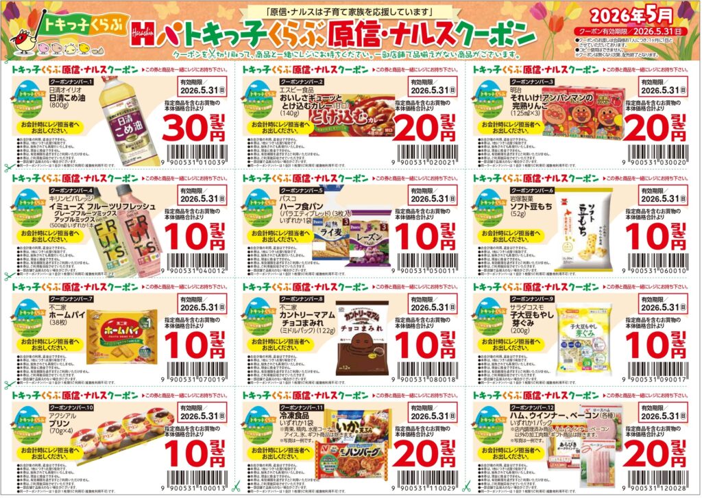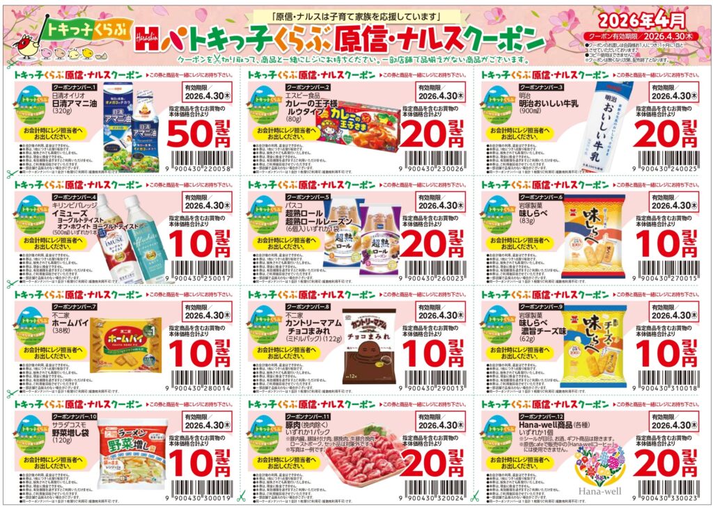 ぜひ毎月、原信・ナルス各店のサービスカウンターでトキっ子くらぶ会員証を提示して、クーポンをもらってくださいね☆