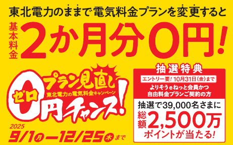東北電力では、キャンペーン期間中に対象プランにご変更もしくは他社からお切替えで対象プランにご加入いただいたお客さまの電気料金を割引する「プラン見直し0円チャンス!」キャンペーンを実施中!