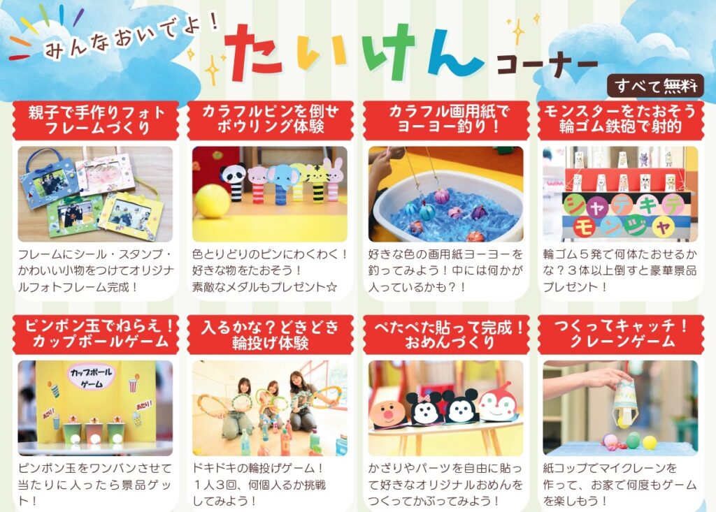 射的、ヨーヨー釣り、輪投げ、ボウリング、クレーンゲーム、カップボールゲーム、おめんづくり、フォトフレームづくりなど楽しい体験が盛りだくさん!
