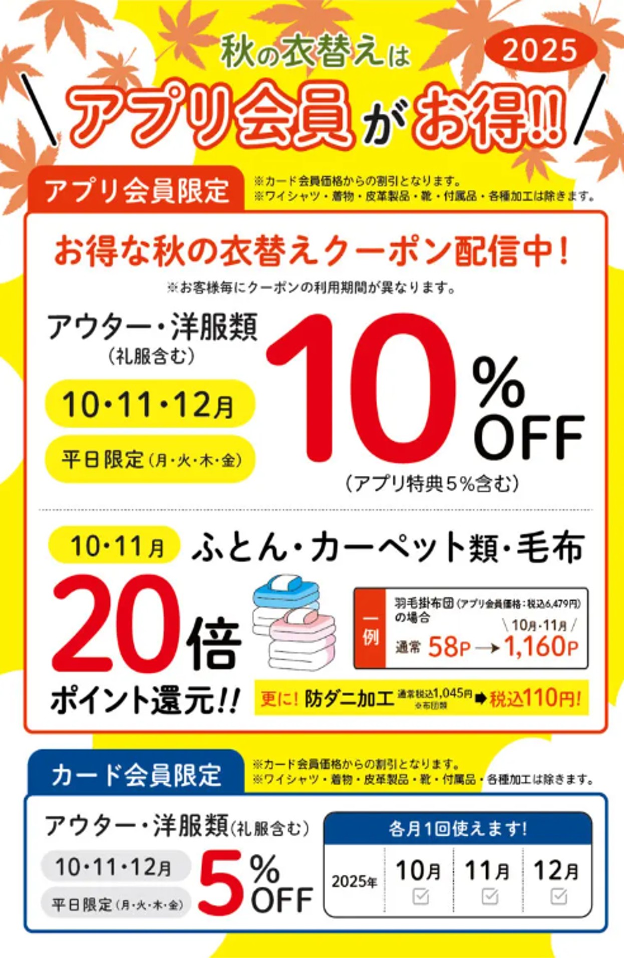 ニューワタナベ、街のせんたく工房全店で会員様限定秋の衣替えセール開催中です♪