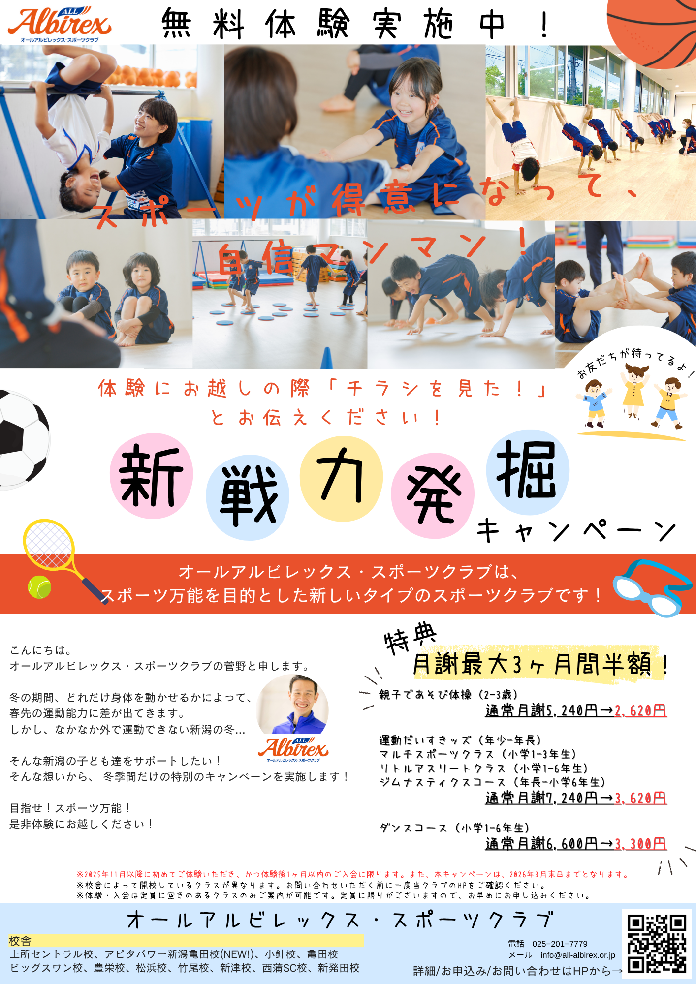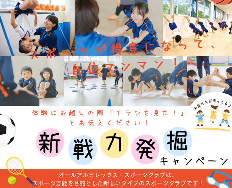 | 運動だいすきッズ(年少~年長) マルチスポーツクラス(小学1~3年生) リトルアスリートクラス(小学1~6年生) ジムナスティクスコース(年業~小学6年生) |