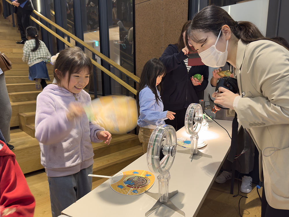 うちわで風を起こして発電したり、手回し発電機で白熱電球と蛍光灯、LED電球の光り方の違いを体験したりする中で、風の強さや照明器具の消費電力によって必要なエネルギーの大きさが変わることを学びました。