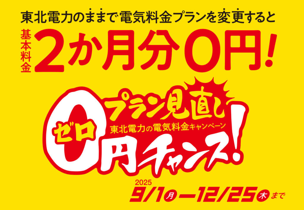 東北電力では、キャンペーン期間中に対象プランにご変更もしくは他社からお切替えで対象プランにご加入いただいたお客さまの電気料金を割引する「プラン見直し0円チャンス!」キャンペーンを実施中!
