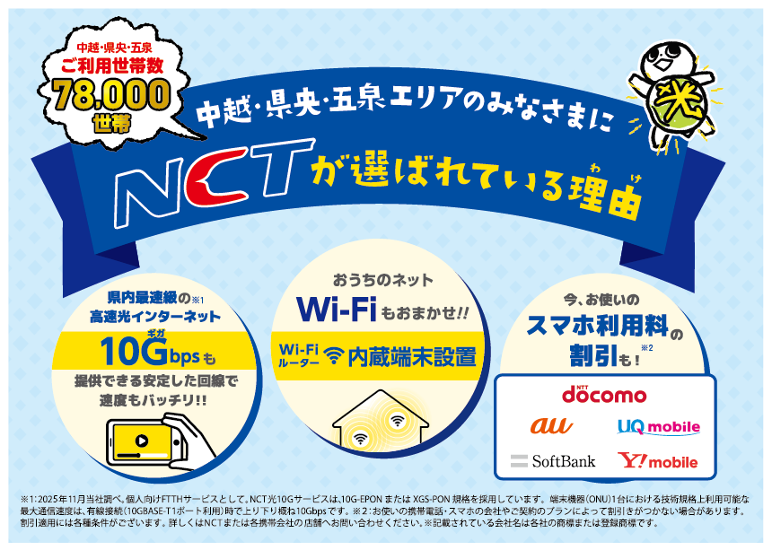 ※一部エリアでのご提供となります。詳しいサービス提供エリアについては、NCTホームページのエリア検索でご確認いただけます。