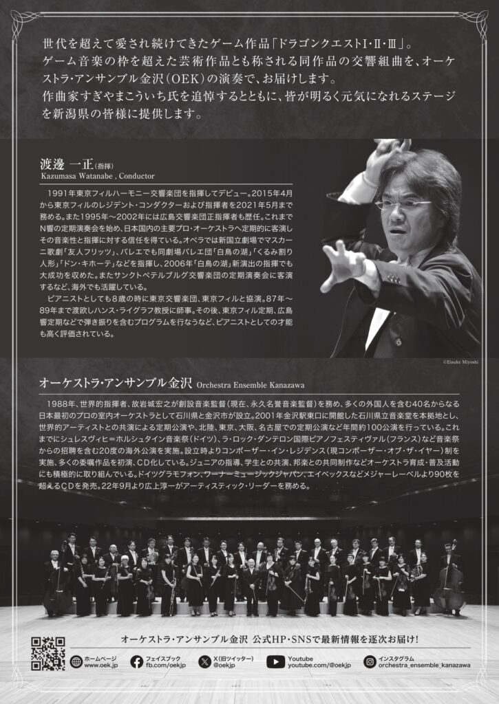 ゲーム音楽の枠を超えた芸術作品とも称される同作品の交響曲を、オーケストラ・アンサンブル金沢(OEK)の演奏でお届けします。
