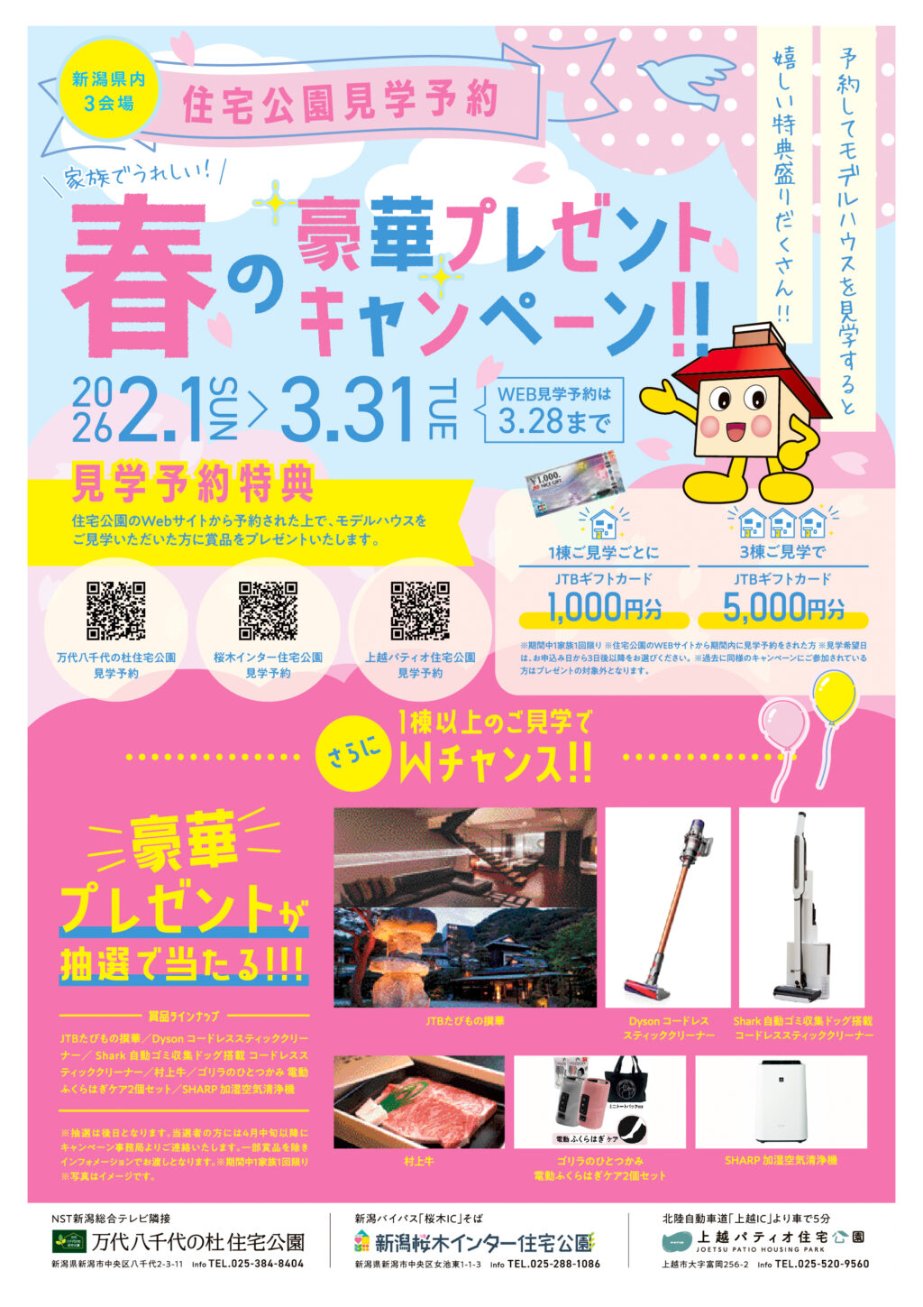 万代八千代の杜住宅公園で、事前予約後モデルハウスをご見学いただいた方にJTBギフトカードをプレゼント!更に豪華プレゼントが抽選で当たる!