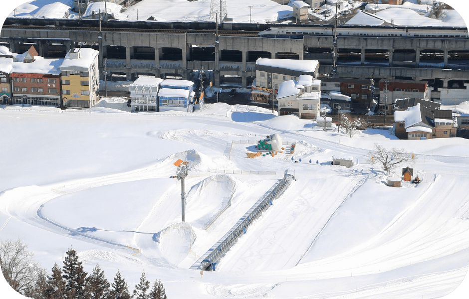 お子さまの“スノーデビュー”に最適なゆきあそびエリア「湯沢温泉ゆきあそびパーク」では、滑り台や多彩なゆきあそびアイテムに加え、滑走体験をより楽しくする遊具もありますよ!初心者のお子さまでも安心して楽しめるよう、安全性にも配慮したアイテムでご家族での思い出づくりを演出いたします!