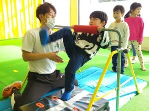 体幹を鍛えるKOBAファンクショナルマットや様々なトレーニング器具(ファンクショナルポール、Finoaトレーニングチューブなど)を活用したプログラムを提供しており、跳び箱や鉄棒、縄跳びなどの体操指導も行っています。
